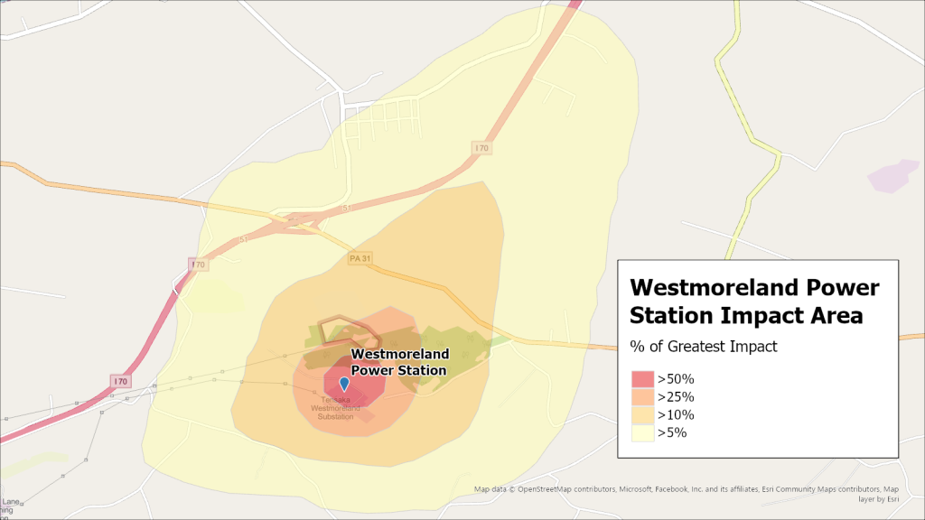 Air dispersion modeling conducted by the Environmental Health Project showing the average distribution of emissions from the facility.